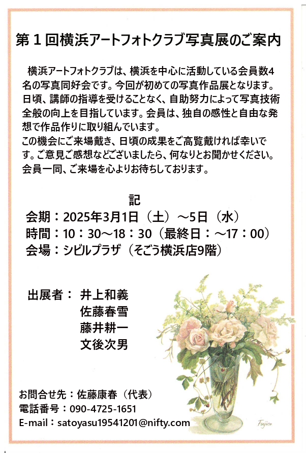 横浜アートフォトクラブは横浜を中心に活動している会員数4名の写真同好会です。今回が初めての写真作品展となります。日頃講師の指導を受けることなく、自助発想で作品作りに励んでいます。この機会にご来場いただき、日頃の成果をご高覧いただければ幸いです。ご意見ご感想などございましたら何なりとお聞かせください。