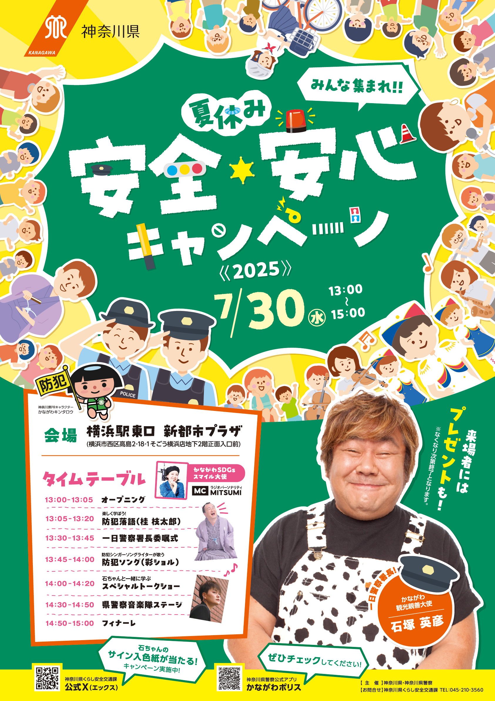 夏休み期間中の子どもたちが、犯罪被害や交通事故に遭うことなく過ごせるよう、注意喚起をするとともに、県内で被害が後を絶たない特殊詐欺を防止することを目的に、一日警察署長をタレントの石塚英彦さんに委嘱し、夏休み安全・安心キャンペーン2025を開催します。