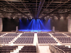 階段式ロールバックチェアと平土間席を使ったシアター形式では、最大約1000人収容可能。